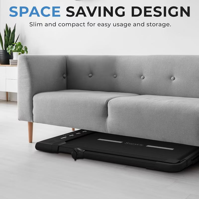 The SereneLife Foldable Motorized Treadmill SLFOLD20 offers a comprehensive home gym experience with its adjustable speed and timer settings, perfect for tailoring workouts to your specific fitness goals. Enjoy seamless tech integration by connecting to popular fitness apps like Fit Home, Kinomap, and Zwift while streaming your favorite Bluetooth music. This treadmill's space-saving foldable design and built-in wheels make it easy to store and move around your home. Track your progress in real-time with the clear LED and LCD displays, showing run time, distance, speed, and calories burned. Engineered with a sturdy 2.5HP motor and shock absorption design, this treadmill ensures a comfortable workout session every time. - Construction Material: Powder Coated Steel, ABS - Motor Power: 2.5HP - Weight Capacity: Up to 265 lbs. - Adjustable Speed Range: 0.6 – 7.6 MPH - Running Belt Size: 16.9” x 43.3” inches - Total Folded Dimensions: 55.5” x 25.9” x 4.3” inches - Total Open Dimensions: 53.7” x 25.9” x 37.8” inches