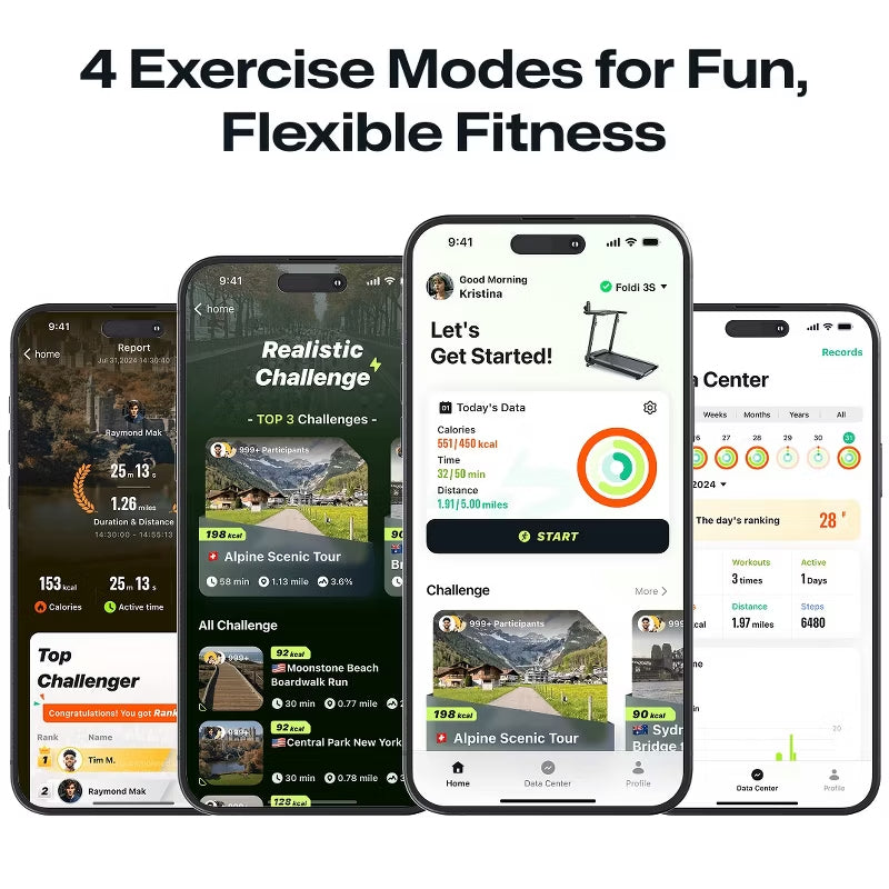 Download the UREVO App to access AI-enhanced workouts that automatically adjust speed and incline based on real-world city maps. Choose from Free Training, Goal Workout, Immersive Running, or Challenge Mode to compete with friends on the leaderboard.